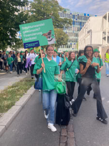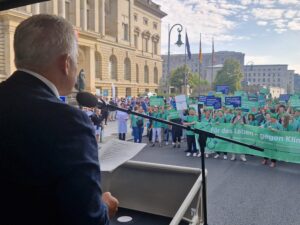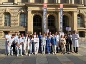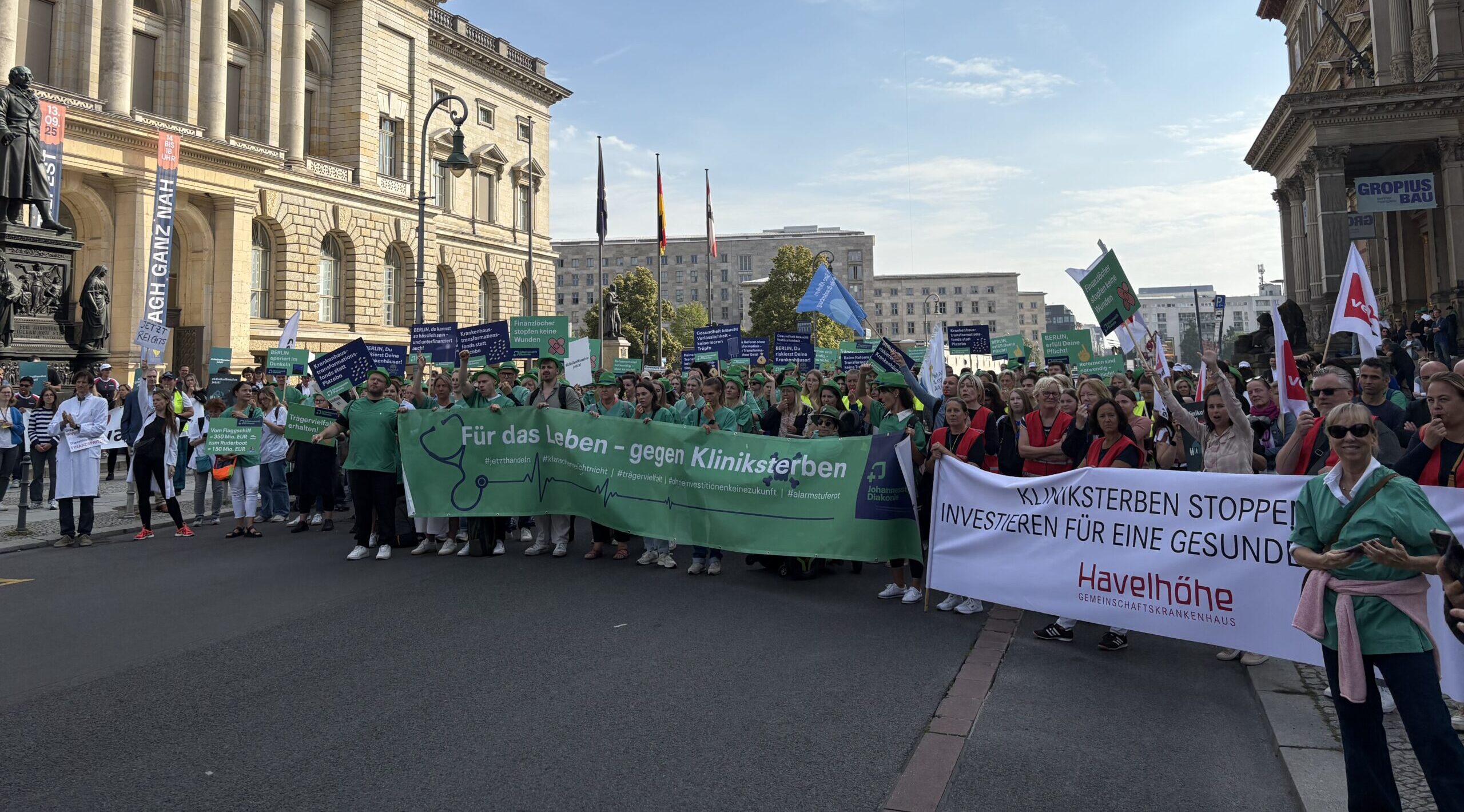 Rund 1.000 Beschäftigte aus Berliner Krankenhäusern, unterstützt durch die Ärztekammer Berlin, den Marburger Bund, Krankenkassen und weiteren Verbänden aus dem Gesundheitswesen, haben am Mittwoch, den 10. September vor dem Berliner Abgeordnetenhaus ein starkes Zeichen gesetzt. Berlin muss seinen Eigenanteil am geplanten Transformationsfonds leisten – sonst verliert die Hauptstadt dringend benötigte Bundesmittel für den Umbau und die Modernisierung der Krankenhausstrukturen.