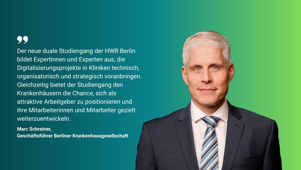 Der Studiengang wurde in enger Zusammenarbeit zwischen der HWR Berlin und der Berliner Krankenhausgesellschaft entwickelt. Krankenhäuser waren in die Konzeption der Studieninhalte eingebunden, um eine praxisnahe und bedarfsgerechte Ausrichtung sicherzustellen. Mit dem Studiengang bringt die BKG ihre Rolle als Impulsgeberin für organisationsbezogene Digitalisierung im Krankenhaus in die akademische Qualifizierung ein.