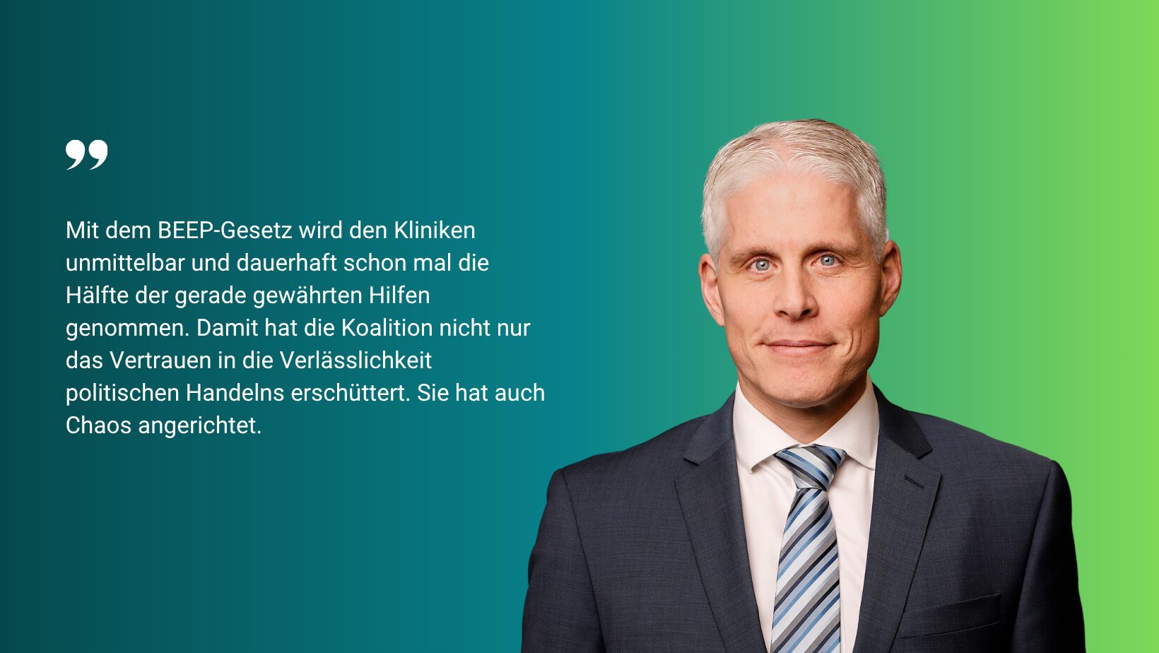 Diese Entscheidung stößt vor allem den Klinik-Vertretern sauer auf: Sie hatten gerade noch die Umsetzung der Sofort-Transformationskostenhilfe erlebt und dürfen ab November einen Rechnungszuschlag erheben. Damit sollten binnen Jahresfrist bis Oktober 2026 zusätzliche vier Milliarden Euro die vormals gerissenen Inflationslücken aufholen. Mit dem BEEP-Gesetz wird den Kliniken unmittelbar und dauerhaft schon mal die Hälfte der gerade gewährten Hilfen genommen. Damit hat die Koalition nicht nur das Vertrauen in die Verlässlichkeit politischen Handelns erschüttert. Sie hat auch Chaos angerichtet.