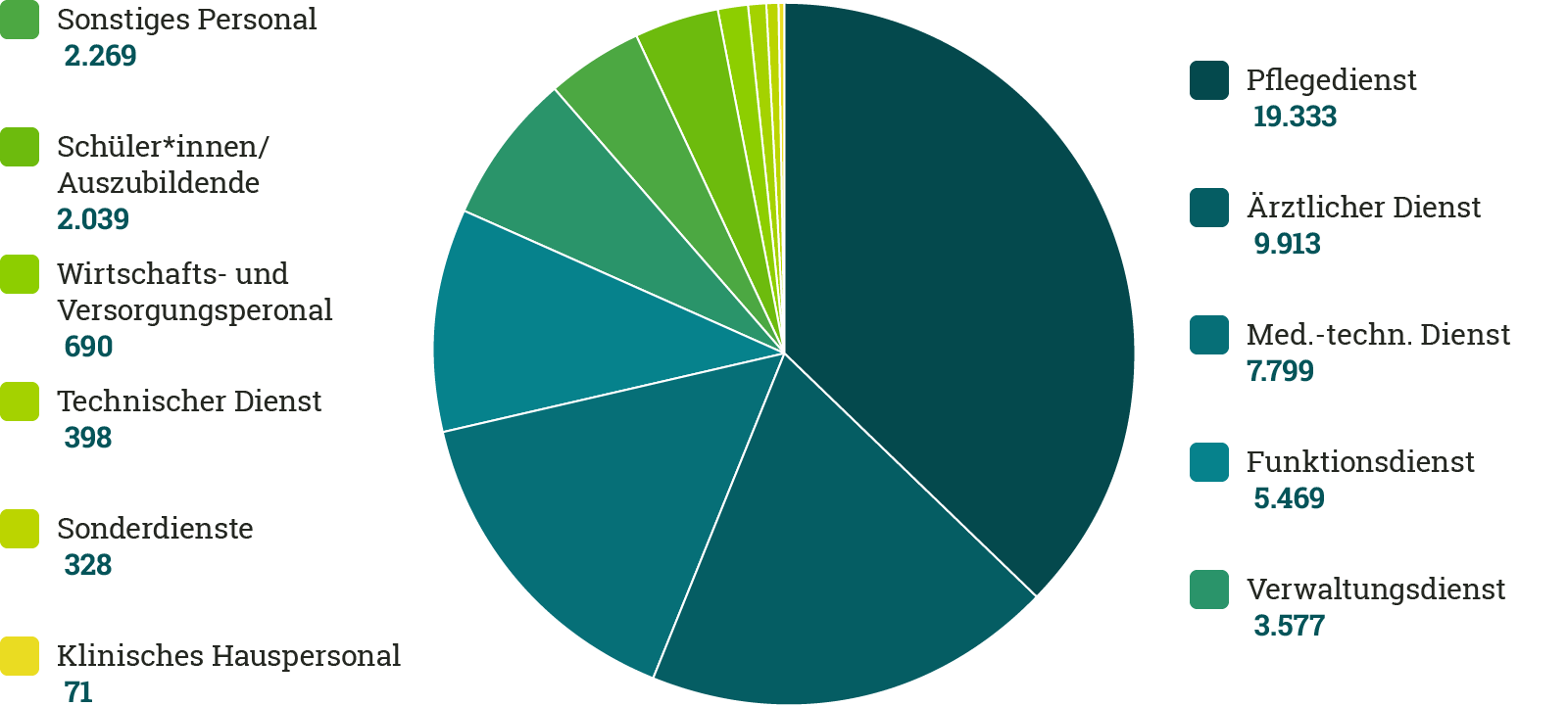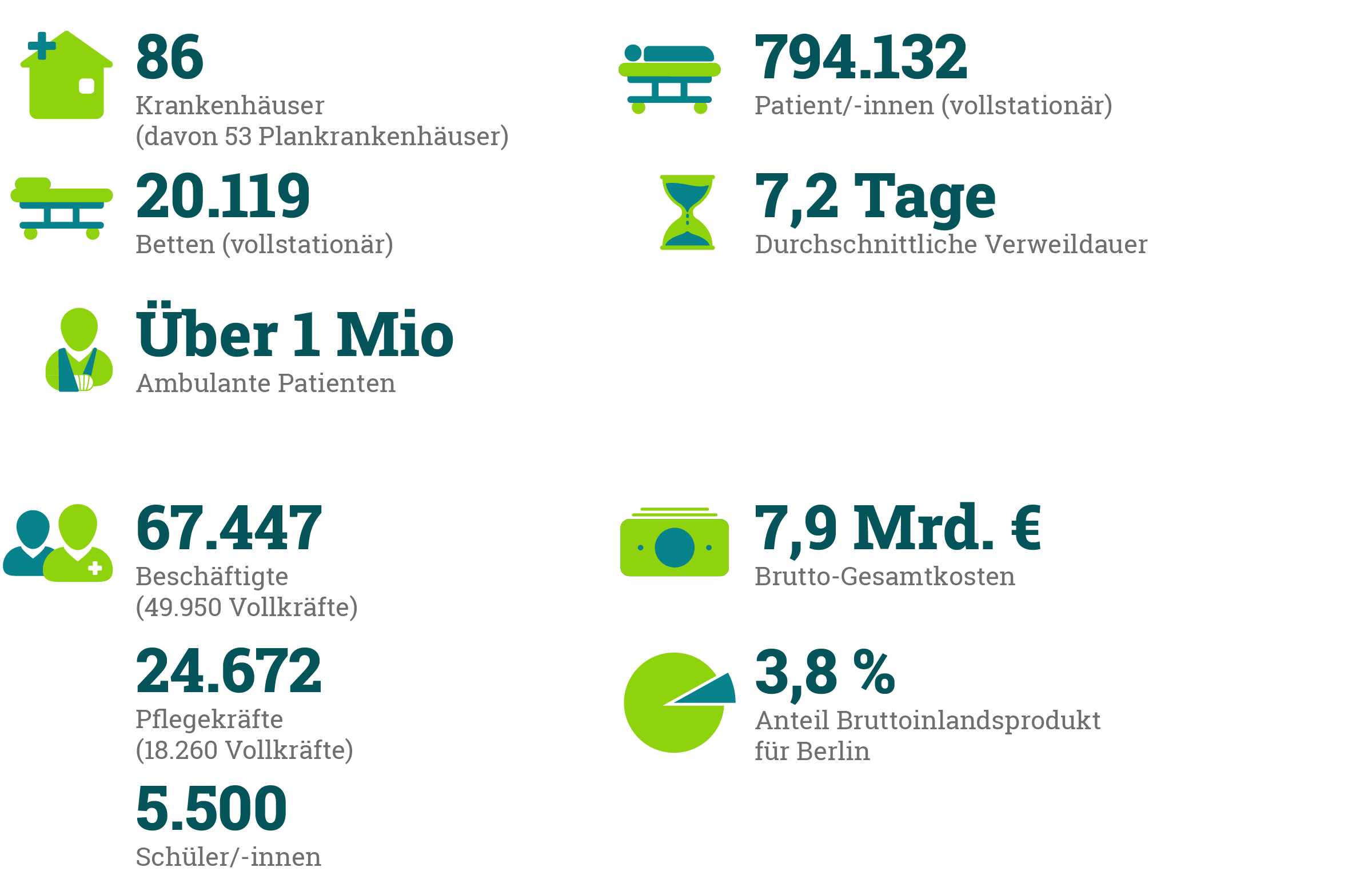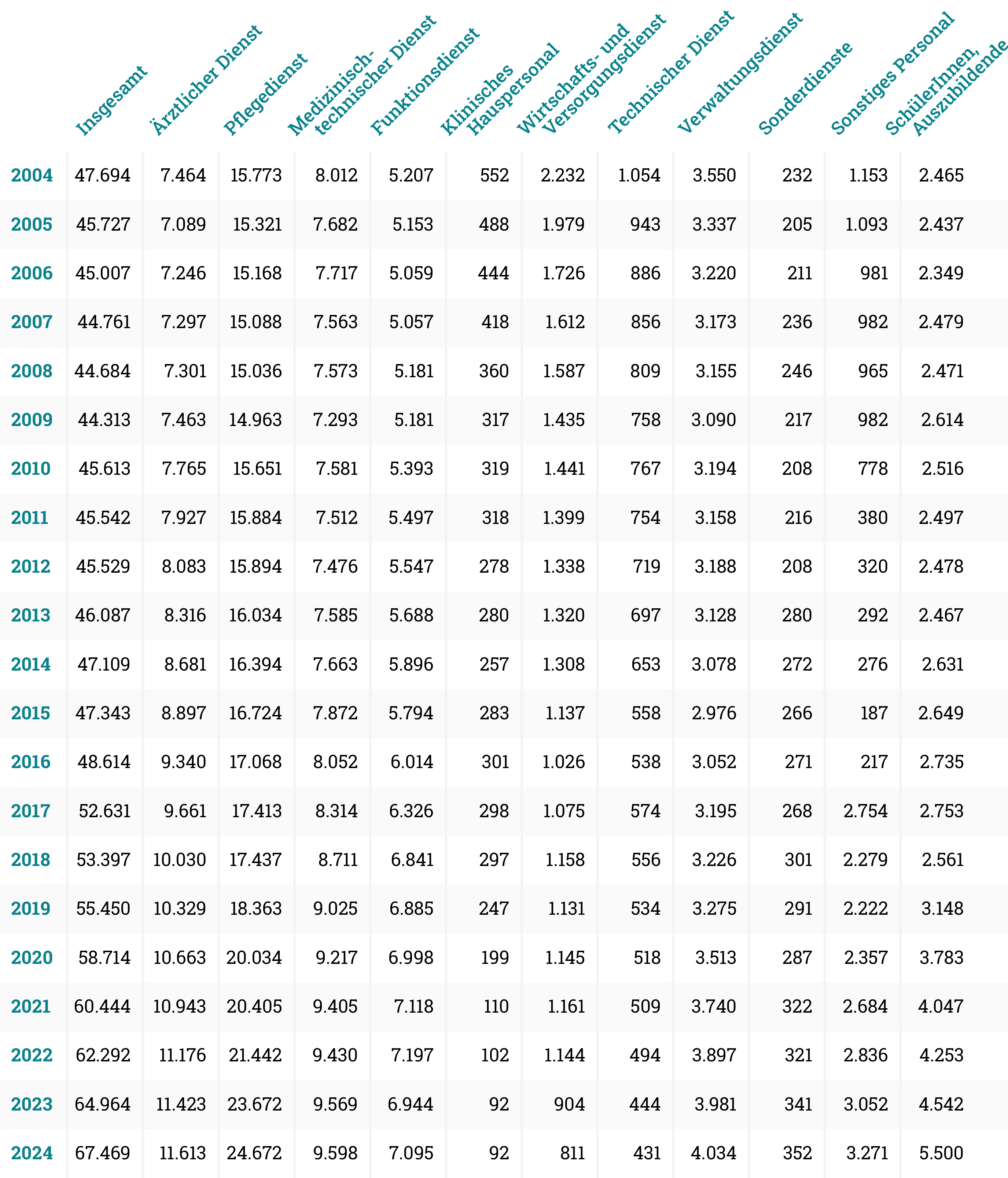 Quelle: Amt für Statistik Berlin-Brandenburg, Krankenhäuser im Land Berlin Teil I: Grunddaten 2024, Tabelle 19, 20, 21 (ohne SchülerInnen, Auszubildende).