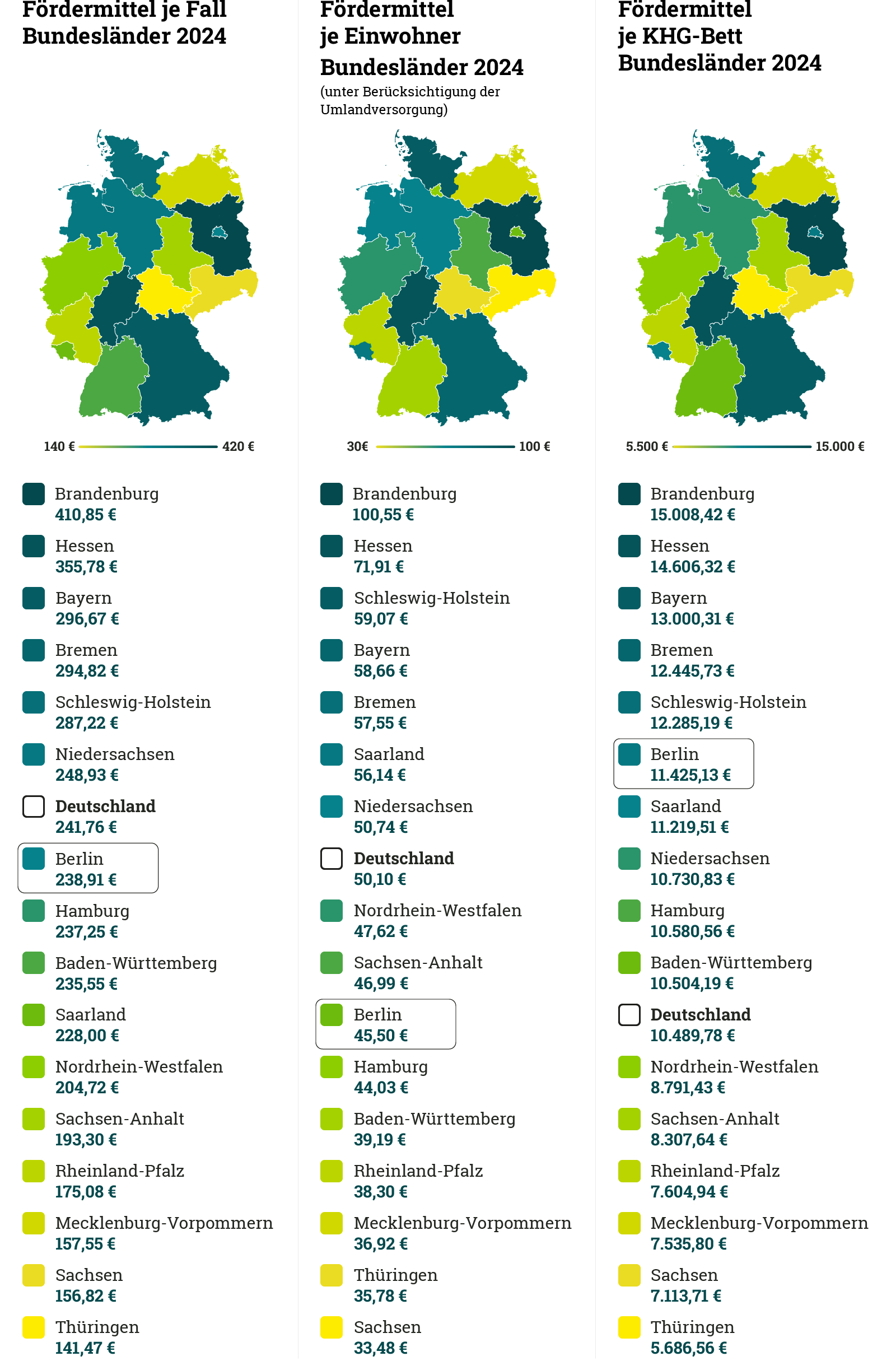 Quelle: DKG: Bestandsaufnahme zur Krankenhausplanung und Investitionsfinanzierung in den Bundesländern. Einbezogen sind die Pauschal- und Einzelfördermittel bzw. Investitionspauschalen. Ein Nachtragshaushalt für Baukostensteigerungen 2023 ist für Berlin nicht enthalten; Statistisches Bundesamt, Fachserie 12, Reihe 6.1 (Grunddaten 2024);